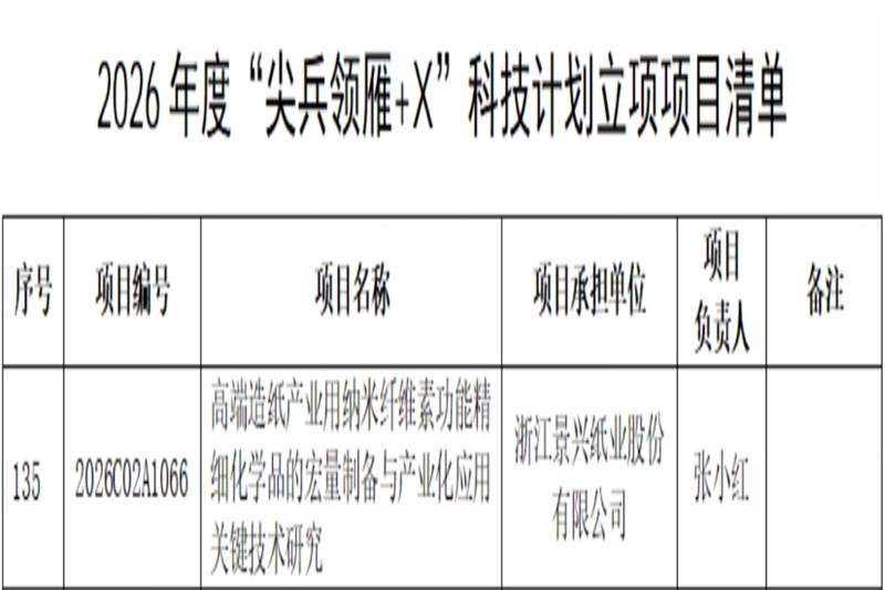 喜報!景興紙業(yè)研發(fā)項目入選2026年度浙江省“尖兵領(lǐng)雁+X”科技計劃
